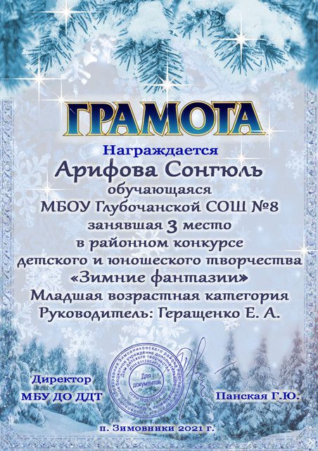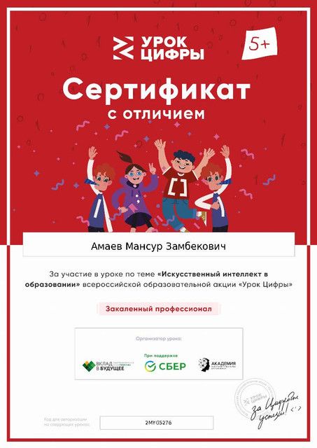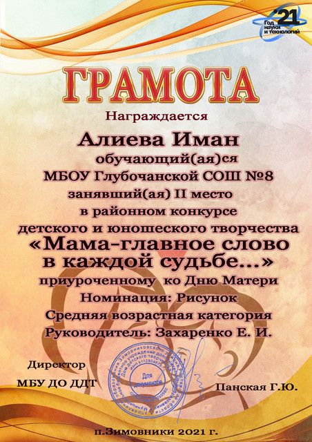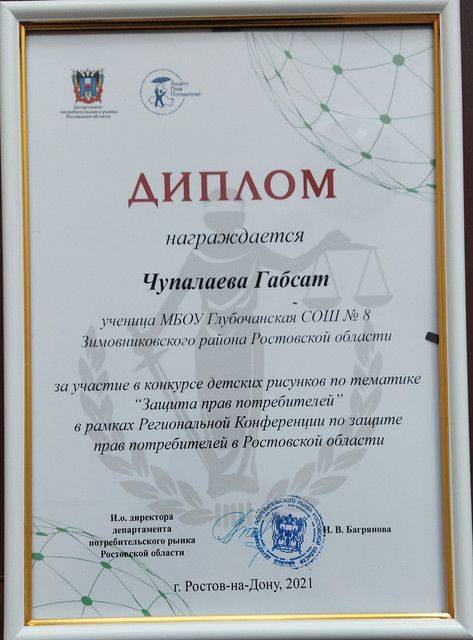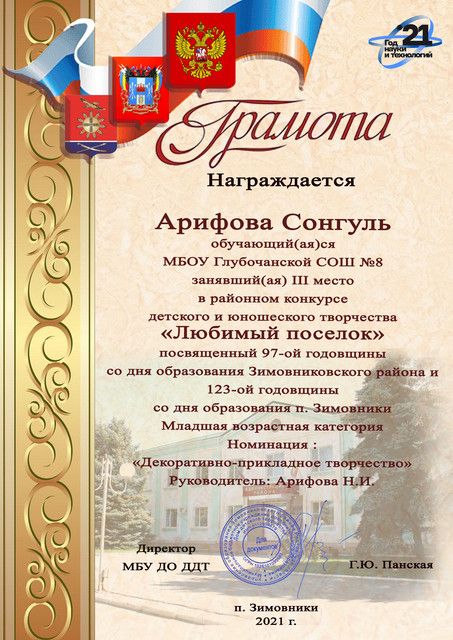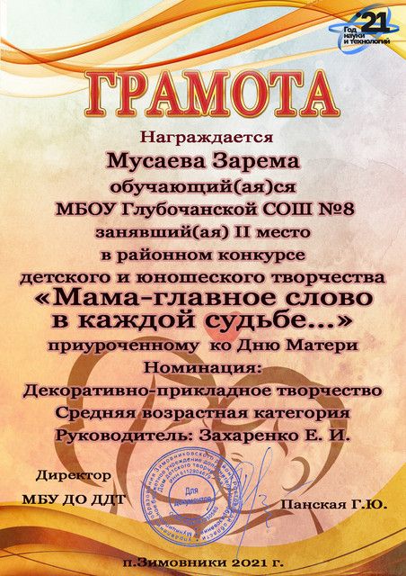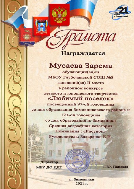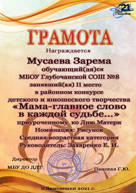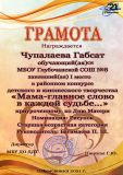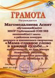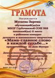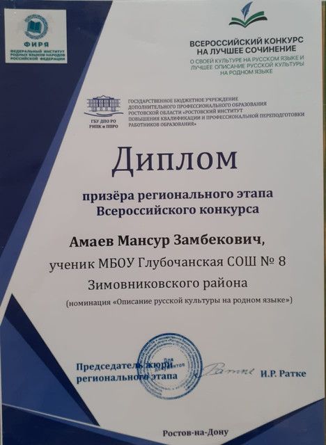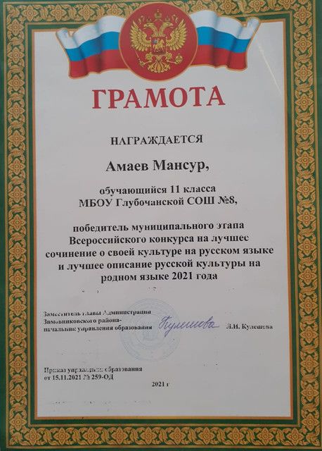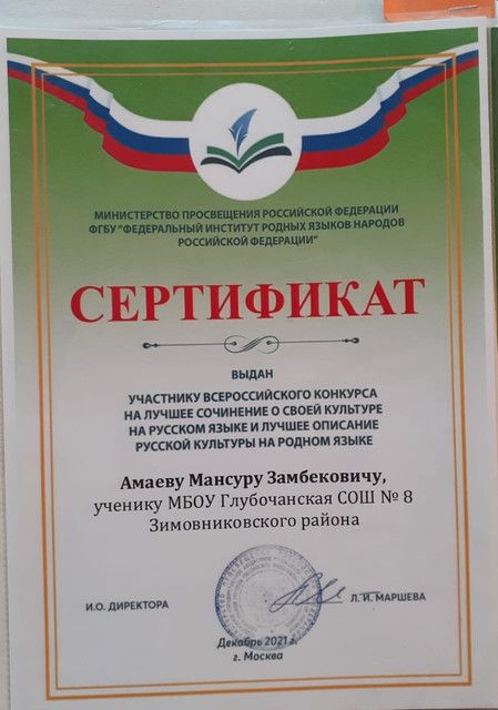 Амаева Мансура - победителя муниципального этапа, призёра регионального этапа и участника Всероссийского конкурса на лучшее сочинение о своей культуре на русском языке и лучшее описание русской культуры на родном языке.